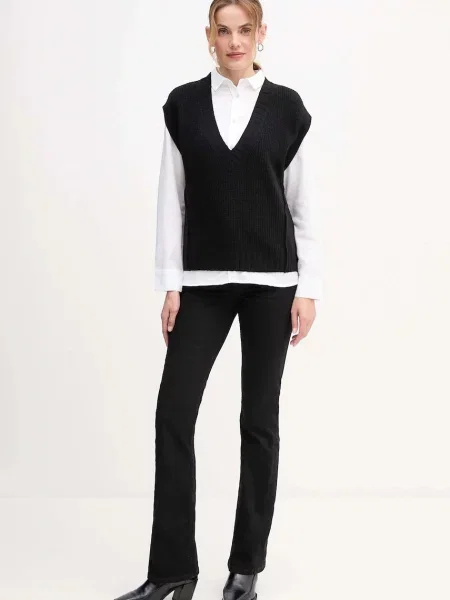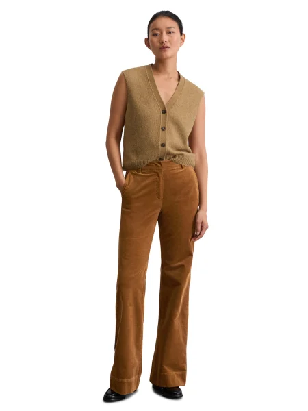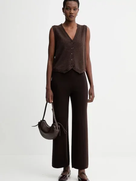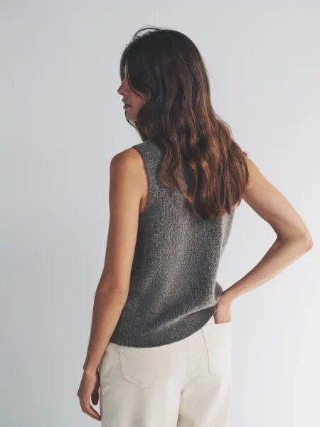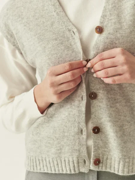 Pomembna je tudi gostota pletenja. Fino pleteni volneni brezrokavniki za ženske sodijo v poslovne kombinacije in pod plašč. Debelejši, strukturirani modeli bolje zadržijo toploto in se izkažejo med vikendom, pri delu od doma ali pri plastenju na prostem. Svoje naredijo še kroj, dolžina in izrez. V-izrez deluje bolj klasično, višji ovratnik pa pride prav, ko zunaj zapiha. Če želite še malo več zaščite pred mrazom, so vredni pogleda tudi ženske telovnike s puli ovratnikom.